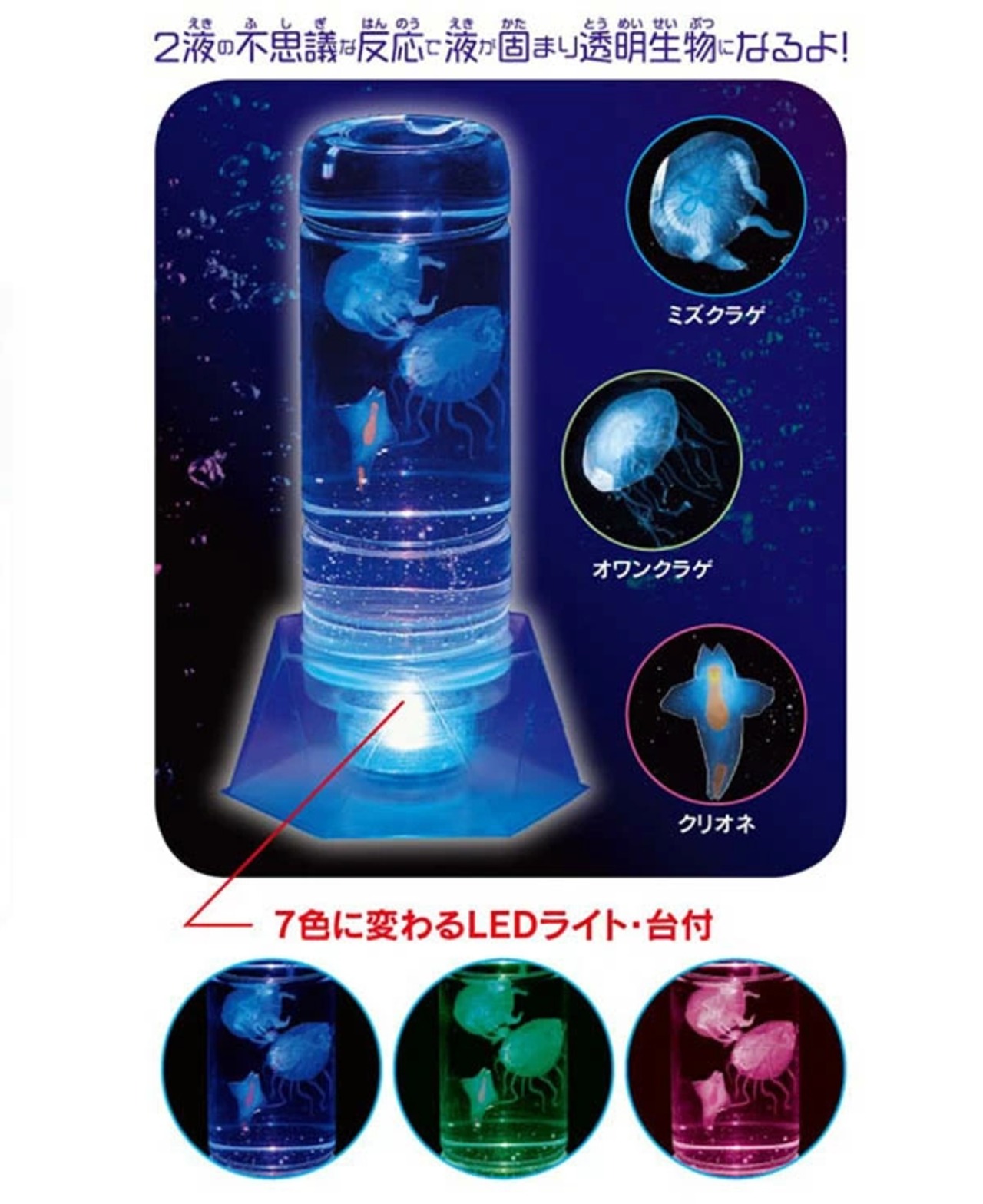 材質:(透明生物のもと)水、アルギン酸ソーダ、防腐剤、(透明生物魔法の液)水、塩化カルシウム、防腐剤、(ボトル溶液)水、キサンタンガム、防腐剤、(ボトル)PET、(カップ)PET、PS、(スポイト)PE、(LEDライト)PVC、(LEDライト台)PET、(透明生物シート)PET、(説明書)紙