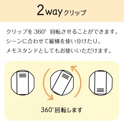 360度回転するクリップで用途に合わせてお使いいただけます。