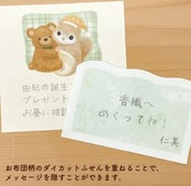 モモンガが描かれた正方形のふせんにお布団柄のダイカットふせんを重ねることで、メッセージを隠すことができます。