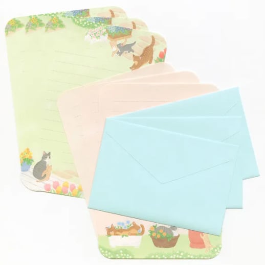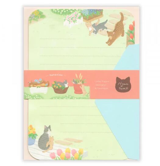 (レターセット にゃんとも 猫 さくら うめ つくし すみれ あんず サバトラ キジトラ クリーム猫 花咲く庭 可愛い 2柄アソート 便箋6枚 封筒3枚 角丸加工 ヨコ11行罫 文房具)