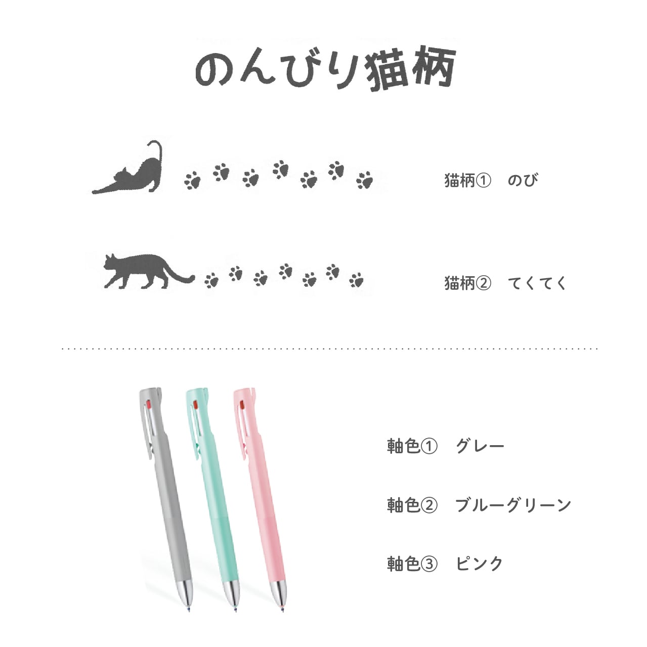 猫柄は「のび」「てくてく」の2種類、ボディーカラーは「グレー」「ブルーグリーン」「ピンク」の3種類からお選びいただけます。