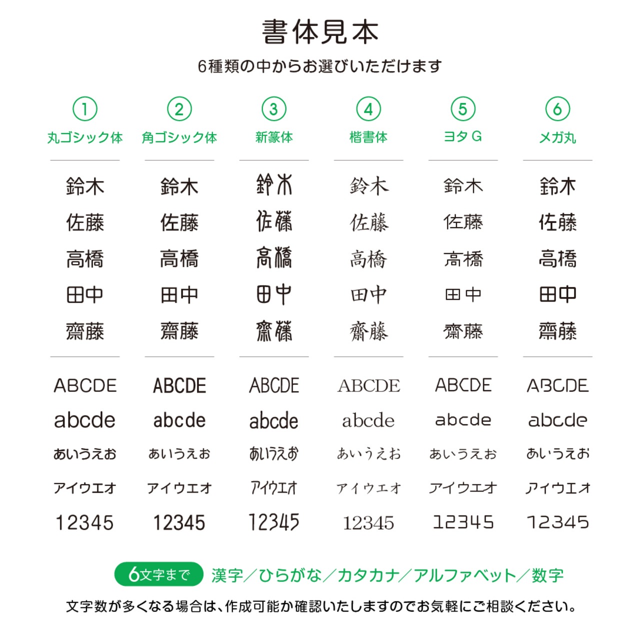 書体もバラエティー豊かに6種類ご用意いたしました!